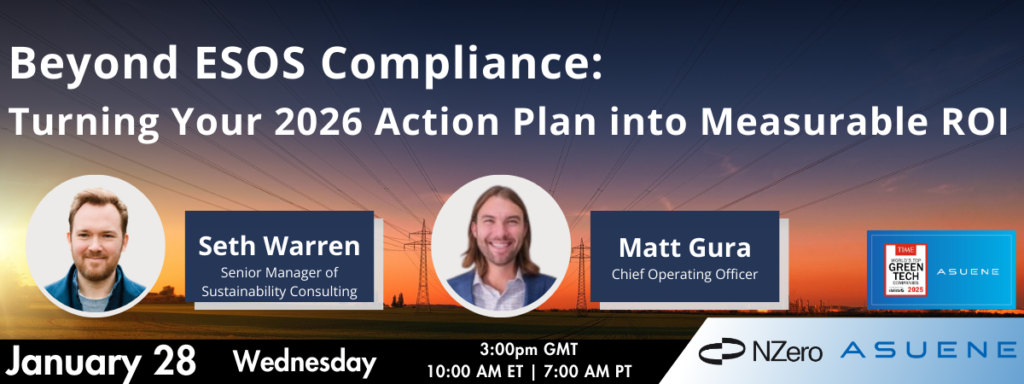 To explore how organizations are turning ESOS action plans into measurable results, NZero will be hosting an upcoming webinar co hosted with ASUENE, featuring our COO Matt Gura and Seth Warren of ASUENE, focused on execution, validation, and energy data readiness ahead of the 2026 reporting milestone.
